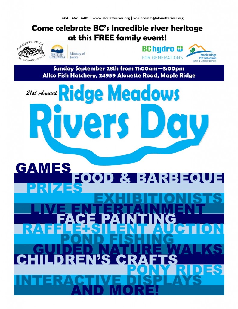 The 21st Annual Ridge Meadows Rivers Day is Sunday, September 28th. The festival will have live musical entertainment including Two Tall Women, Chico & Tim, Gord & Trish, Click & Clown, face-painting by the Emerald Pig Society, environmental exhibitors, and the much-loved trout fishing pond with the BC Federation of Drift Fishers. Activities include scavenger hunts, nature walks, and birdhouse building, with materials donated by