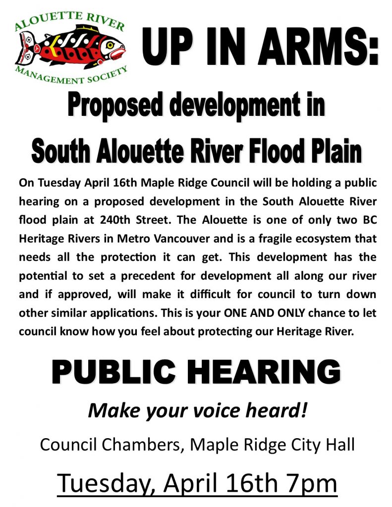 In conclusion, with over 80% of this development being in the flood plain, the impact on the river and the surrounding watershed will undermine the fabric and intent of our Official Community Plan as it relates to protecting the environment and our waterways, which ARMS actively strives to support within our mandate. And while we recognize that the amenity gain of conservation land in such a desirous location may seem to justify the impacts on the river, we believe that logic should instead fall on the side of continuing to protect this heritage river and the fish habitat and wildlife corridors that are already under assault. We also strongly argue that RS-3 and RS-2 in the flood plain should not be included within Density Bonus consideration and this was an error when the by-law was adopted.